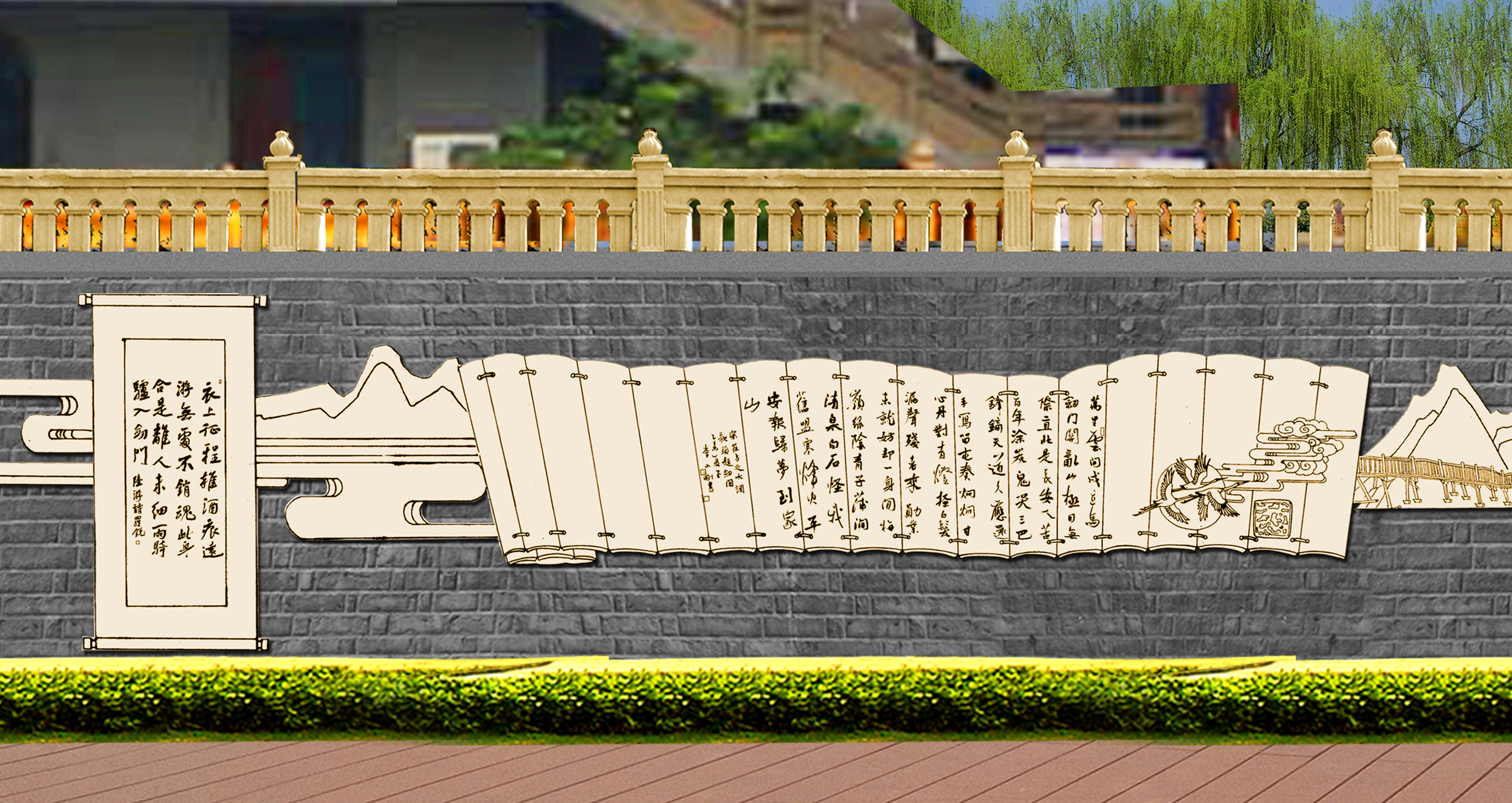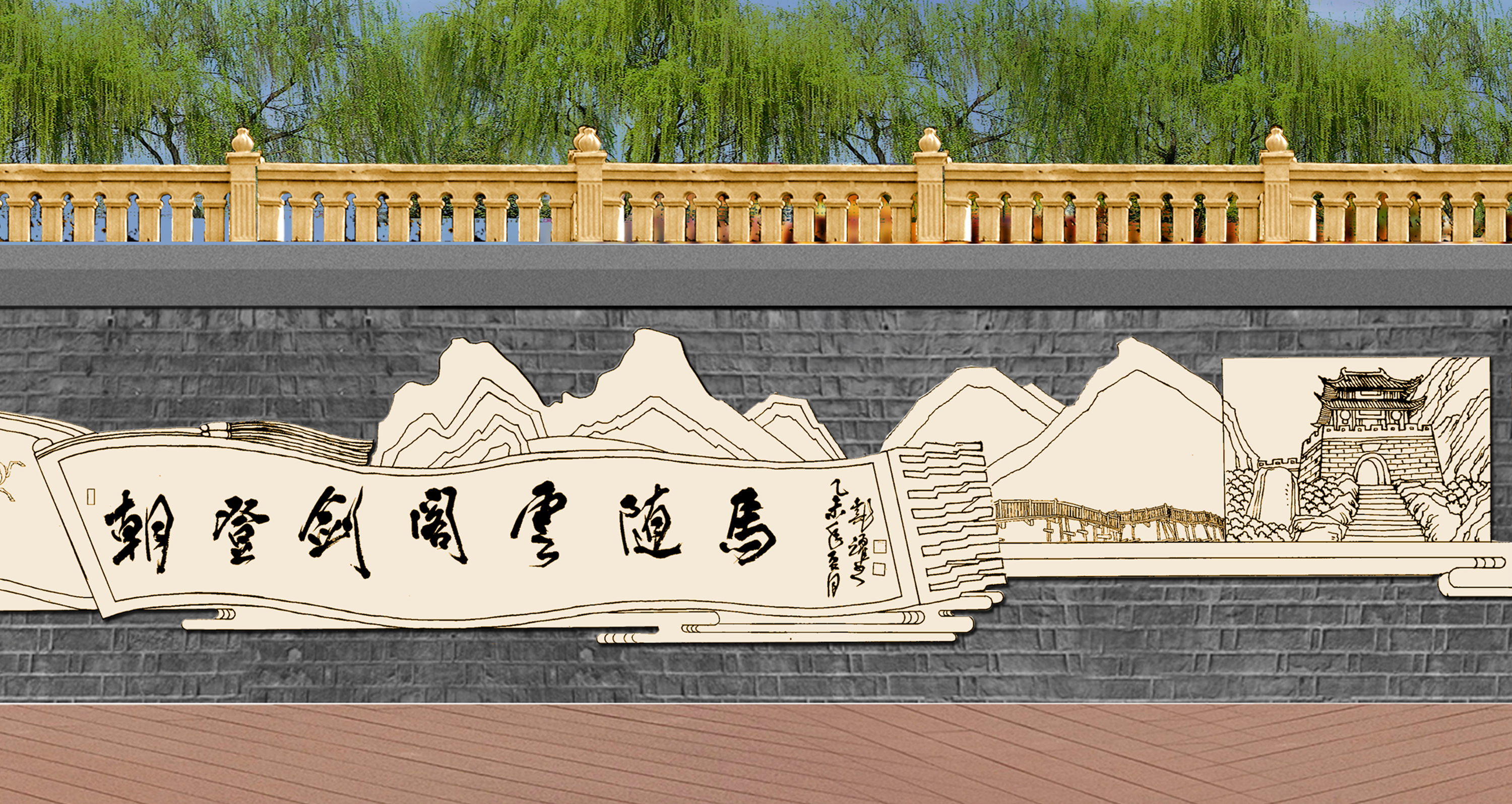 蜀道詩(shī)歌大道位于廣元市區(qū)嘉陵江畔,背靠鳳凰山景區(qū),與皇澤寺景區(qū)隔江相望。整個(gè)蜀道詩(shī)歌大道沿著廣元市區(qū)的嘉陵江,從摩爾天城到將軍橋,途經(jīng)利州西路、打鐵街、大西路、望江樓、小西路、皇澤大橋等,全長(zhǎng)約3 公里。通過對(duì)蜀道文化的深刻解讀,以廣元“生態(tài)立市、文旅興市”的發(fā)展戰(zhàn)略為理念,充分結(jié)合大唐利州女皇城、國(guó)家歷史文化名城創(chuàng)建、嘉陵江生態(tài)文化休閑軸營(yíng)造文化休閑長(zhǎng)廊。設(shè)計(jì)上以石刻為核心表現(xiàn)手法,同時(shí)融合蜀道山川、壁畫、卷軸、碑林、綠植等設(shè)計(jì)元素,營(yíng)造出整體統(tǒng)一、厚重,局部多姿多彩的蜀道詩(shī)歌大道。
