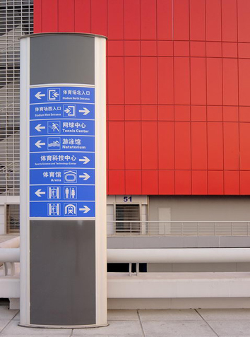 由于該工程的體育特性,增加了標(biāo)識系統(tǒng)設(shè)計的難度,我們由內(nèi)而外、從大到小地深入研究三級導(dǎo)視的分布,將人流導(dǎo)入與分流做到了高效、安全、流暢;對看臺區(qū)域和觀眾席牌數(shù)及座位指示牌的設(shè)計,我們進(jìn)行了嚴(yán)格的優(yōu)選,讓觀眾能根據(jù)指示牌,迅速找到自己的座位。同時,在標(biāo)識系統(tǒng)的設(shè)計中,我們還對標(biāo)識的形式、尺度、色彩、材質(zhì)、照明和安裝等功能屬性進(jìn)行了探討,使該工程獲得最佳實際效果。經(jīng)十運(yùn)會期間十萬人流量的實踐證明,我們所設(shè)計的該套標(biāo)識系統(tǒng)完全科學(xué)、合理。