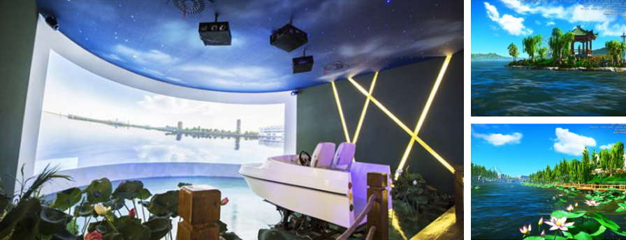 虛擬游船漫游系統(tǒng)又叫仿真船駕駛---真實模擬船在水中行進的動感效果,同時讓參觀者欣賞海洋上的的風景。為參觀者提供一個逼真的水面的環(huán)境,從視覺上、聽覺上、感覺上和觸覺上模擬船從啟動、行駛、顛簸等過程,并能感受到不同的時間、不同的氣候、不同的景點的景觀,小船行駛的過程中,動力設(shè)備可以模仿船舶真是行駛時的搖曳和擺動,同時特效設(shè)備可配合場景制造淋雨、飄雪、閃電、刮風等天氣變幻的效果。給體驗者一個完美的享受。