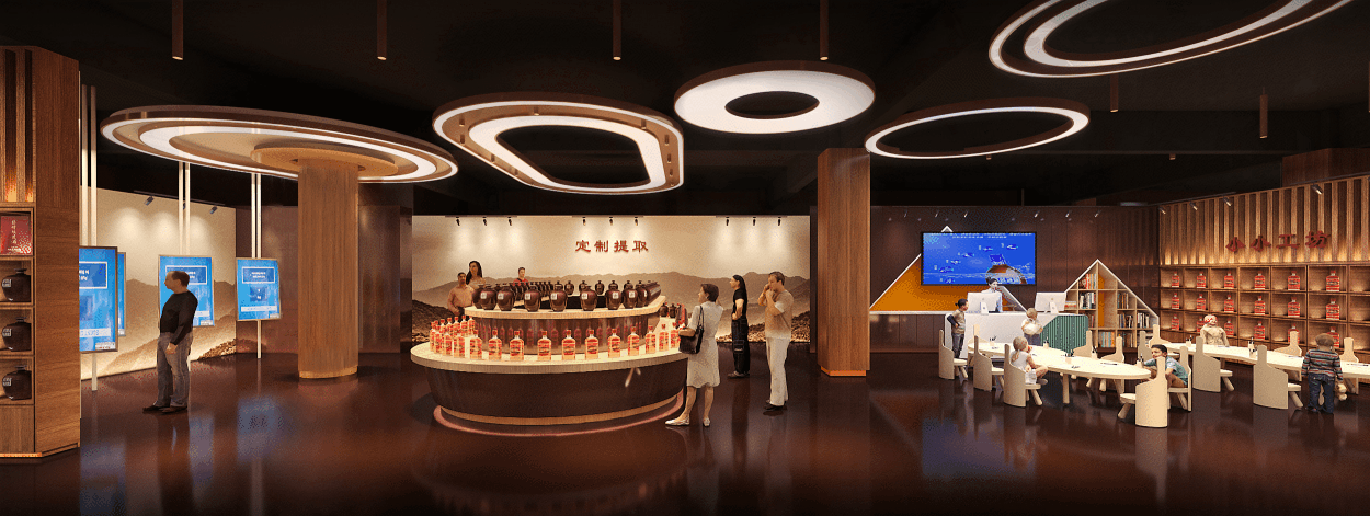 B館總面積約13000平米,是展售一體的勁牌產(chǎn)品體驗館。整個展館共有四層,分別為展銷定制區(qū)、品調(diào)私享區(qū)、美酒銀行封壇區(qū)和酒海遨游倉儲區(qū)等四個主體功能區(qū),展示勁牌酒類豐富、倉儲如海,兼具展覽展示、銷售接待、酒品定制等功能。