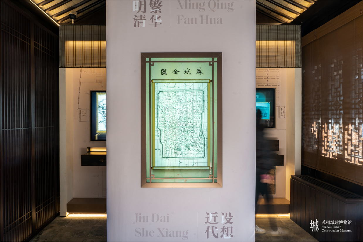 金螳螂文化項目團隊以蘇州之窗為核心元素構(gòu)建了穿越古今的時光通道,貫穿起蘇州城建博物館城紀千載、現(xiàn)代蘇城、城市生長、城市客廳、百館之城等主要展廳。