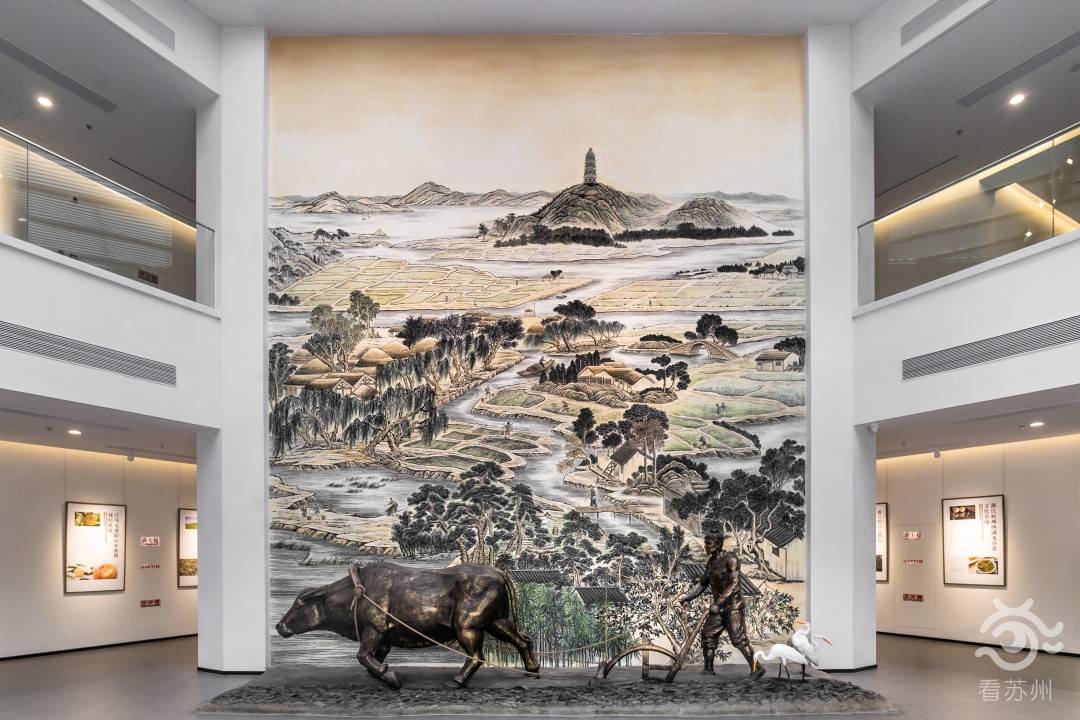 抬頭望,正對入口的浮雕畫,是根據(jù)清朝康熙時期《耕織圖》和乾隆時期《姑蘇繁華圖》創(chuàng)作而成的江南農耕生產(chǎn)圖,生動再現(xiàn)了江南水稻、蠶桑、茶果、漁業(yè)為特色的傳統(tǒng)農業(yè)生產(chǎn)方式。