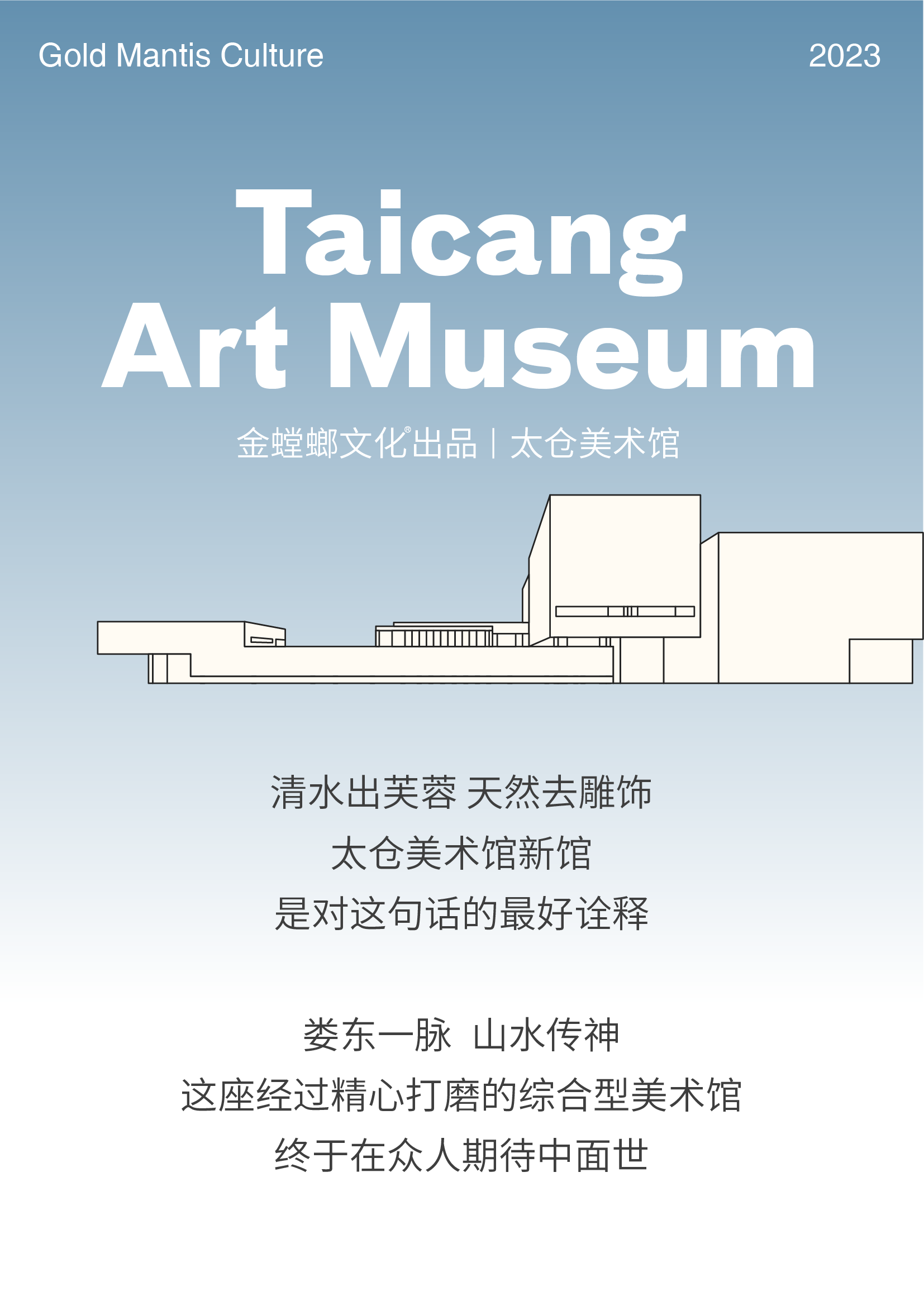 現代美學與園林雅致交融 太倉美術館新館 總建筑面積約1.65萬平方米 延續(xù)了清代太倉園林的空間結構 營造園林式的觀感體驗 太倉美術館建筑采用大面積白色清水混凝土,混凝土獨特的厚重感和雕塑感還原了婁東畫派濃墨山水的意境,蘊含著“婁東一脈,山水傳神”的象征意義。 這里擁有展覽區(qū)、學術討論、公共教育、咖啡區(qū)及文創(chuàng)商店等多個功能區(qū),其中展覽區(qū)分為7個展廳,展廳總面積約為 3220 平方米。 旋轉屏幕欣賞 整個美術館利用光線和建筑陰影的巧妙結合,將看似單調的平面幻化切割出了不同的空間,并隨著一日時光的流轉不斷變化著。 與光完美融合,賦予了冰冷的水泥溫暖的質感。 室內與室外的自然元素相互交融,空間流動,一步一景。 從不同角度都可以收獲獨屬的構圖,自然溫柔又富有藝術生機的空間氛圍感,值得慢慢品味。 文藝是時代前進的號角,最能代表一個時代的風貌。 太倉市人民政府和中國對外文化集團共同主辦“潮涌大江東——太倉美術館開館展”。 01 鑄魂新時代——當代藝術名家邀請展 02 平遠?音色?構成——德國繪畫藝術作品展 03 世紀經典——二十世紀中國畫大師作品展 04 藍色回響——“一帶一路”藝術交流展 05 高山仰止——婁東畫派精品展 本次展覽將展出天津博物館館藏的“婁東畫派”精品以及中國對外藝術展覽有限公司收藏的齊白石、徐悲鴻、潘天壽、傅抱石、李可染等數十位二十世紀中國畫大師真跡。 還將展示十年來中國與“一帶一路”沿線國家的藝術交流成果、德國當代繪畫作品以及當代中國藝術創(chuàng)作的多元面貌。 和而不同,藝術大觀。根據美術館對于油畫展、書畫展、主題文化展、當代藝術展等內容的展示需求,金螳螂文化項目團隊定制了七個展廳空間。 以藝術化的設計傳達空間美感,為藝術展覽提供適宜棲所。讓藝術走進生活,美美與共。 人間皆是浪漫,藝術永不落幕。在太倉美術館這個被珍藏的免費藝術空間里,各種精品展覽、講座和配套公教活動將會陸續(xù)推出,期待您的到訪與探索。 金螳螂文化有幸參與“潮涌大江東——太倉美術館開館展”的建設,以專業(yè)的項目設計實施助力太倉美術館順利開館,以敬業(yè)的精神持續(xù)探索文化展示行業(yè),愿做文化與藝術的傳播者。