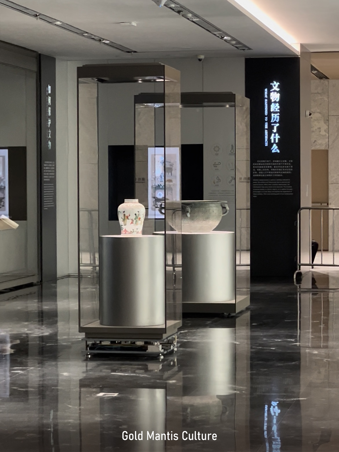 細(xì)節(jié)設(shè)計(jì)提煉玉器的造型、紋飾、質(zhì)感、色彩等元素符號(hào),通過(guò)照明層次設(shè)置、“玉”字墻裝置點(diǎn)綴、柜型變化等,全方位提升展示效果和品質(zhì)。