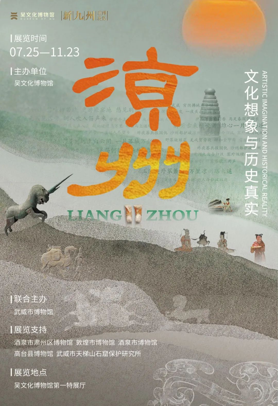 “葡萄美酒夜光杯,欲飲琵琶馬上催, 醉臥沙場君莫笑,古來征戰(zhàn)幾人回”。 唐朝詩人王翰的《涼州詞》 滿足了我們對于涼州 所有關于地域和文化方面的想象。 涼州,連接南北,溝通東西, 雜糅胡漢,融匯中外。 “涼州——文化想象與歷史真實”特展甄選了3個地市、6家博物館共181套272件文物,由吳文化博物館和武威市博物館聯(lián)合主辦,酒泉市肅州區(qū)博物館、敦煌市博物館、酒泉市博物館、高臺縣博物館 、武威市天梯山石窟保護研究所大力支持。展覽由金螳螂文化設計實施。 △ 7月25日,特展開幕式現(xiàn)場 本次“涼州——文化想象與歷史真實”特展,即是“新九州”系列展的第四期。 展覽分為“早期東西交流前沿”“河西四郡:涼州的‘第一塊拼圖’”“五百年間延綿一脈”“涼州七里十萬家”“瀚海明珠:西夏輔郡”“西風漫卷:詩思入涼州”六個單元展開敘述,力圖通過恢宏的歷史與真實敘述的視角,帶給觀眾無比豐富的文化想象空間。 涼州,這個想象力肆意迸發(fā)之所,曾是漢唐雄風的邊陲重鎮(zhèn),亦是胡漢交融的文明樞紐,它以蒼茫的地理坐標,錨定了華夏文明向西拓進的壯闊史詩。吳地文化以其細膩、靈動的特質,與涼州的豪邁、雄渾形成鮮明對比,這種差異,為我們提供了更廣闊的交流空間與更深邃的文化思考。 在歷史長河中,吳地與涼州雖相隔千里,卻通過絲綢之路等交流通道,相互影響、相互借鑒,不僅促進了兩地的共同發(fā)展,也為中華文化注入了新的活力。 從漢代的“河西四郡”到隋唐的“西域四郡”“安西四鎮(zhèn)”,可以說漢唐氣象半在河西,以涼州為最;及至宋元,黨項與蒙古的入駐為河西文化注入新的血液;降至明清,隨著絲綢之路的逐漸衰落,涼州也從對外開放的門戶變作控馭西陲的要沖。 撫今追昔,在追慕漢唐磅礴浪漫的光榮與夢想時,涼州始終是寄托美好想象的重要承載。 涼州不僅是華夏視野中的文化昌盛之地 也是漢唐磅礴浪漫的 光榮與夢想的重要載體 觸摸涼州跳動的脈搏 品嘗它千年的滋味 聆聽那些被風沙打磨過的傳奇故事 走,去涼州,讓想象力飛一會兒! 特 展 信 息 展覽名稱:涼州——文化想象與歷史真實 展覽時間:2025.07.25-2025.11.23 展覽地點:吳文化博物館一樓第一特展廳